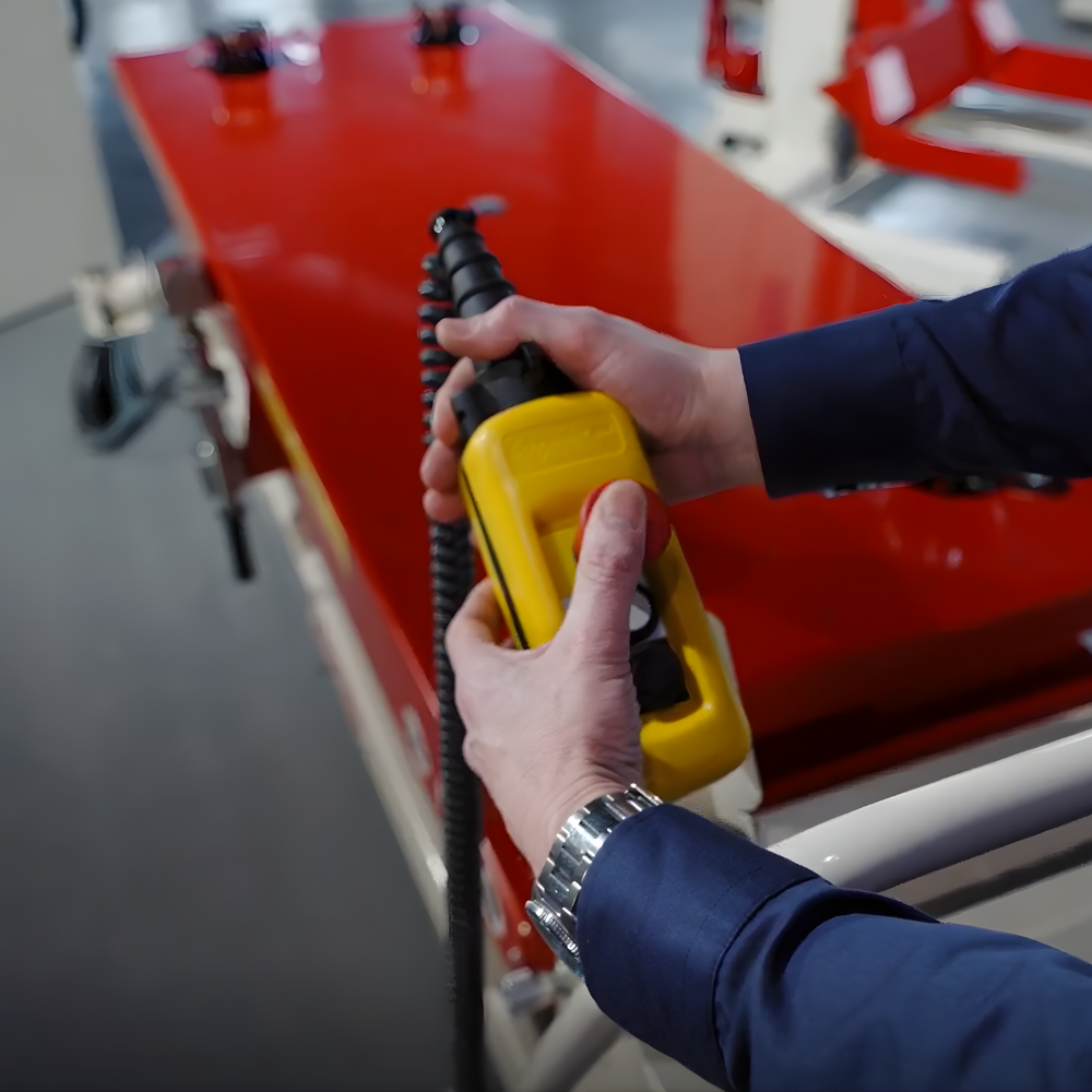 Fine‑adjustment mechanisms for roll and pitch allow millimetre‑accurate positioning, even when handling components up to 2,000 kg. The wired remote control provides clear visibility of critical alignment points, and adjustable lifting and lowering speeds enable technicians to work with precision during installation and removal procedures. For additional workshop safety, the HDLT‑20 moves cable‑free to eliminate tripping hazards and includes integrated forklift pockets for internal transport.